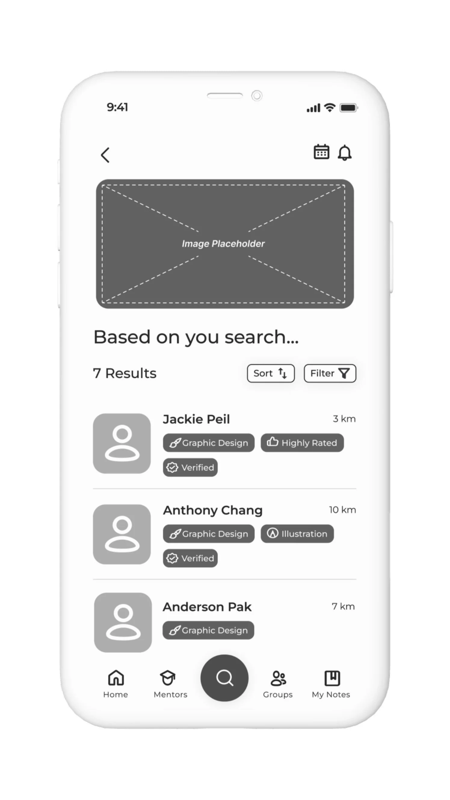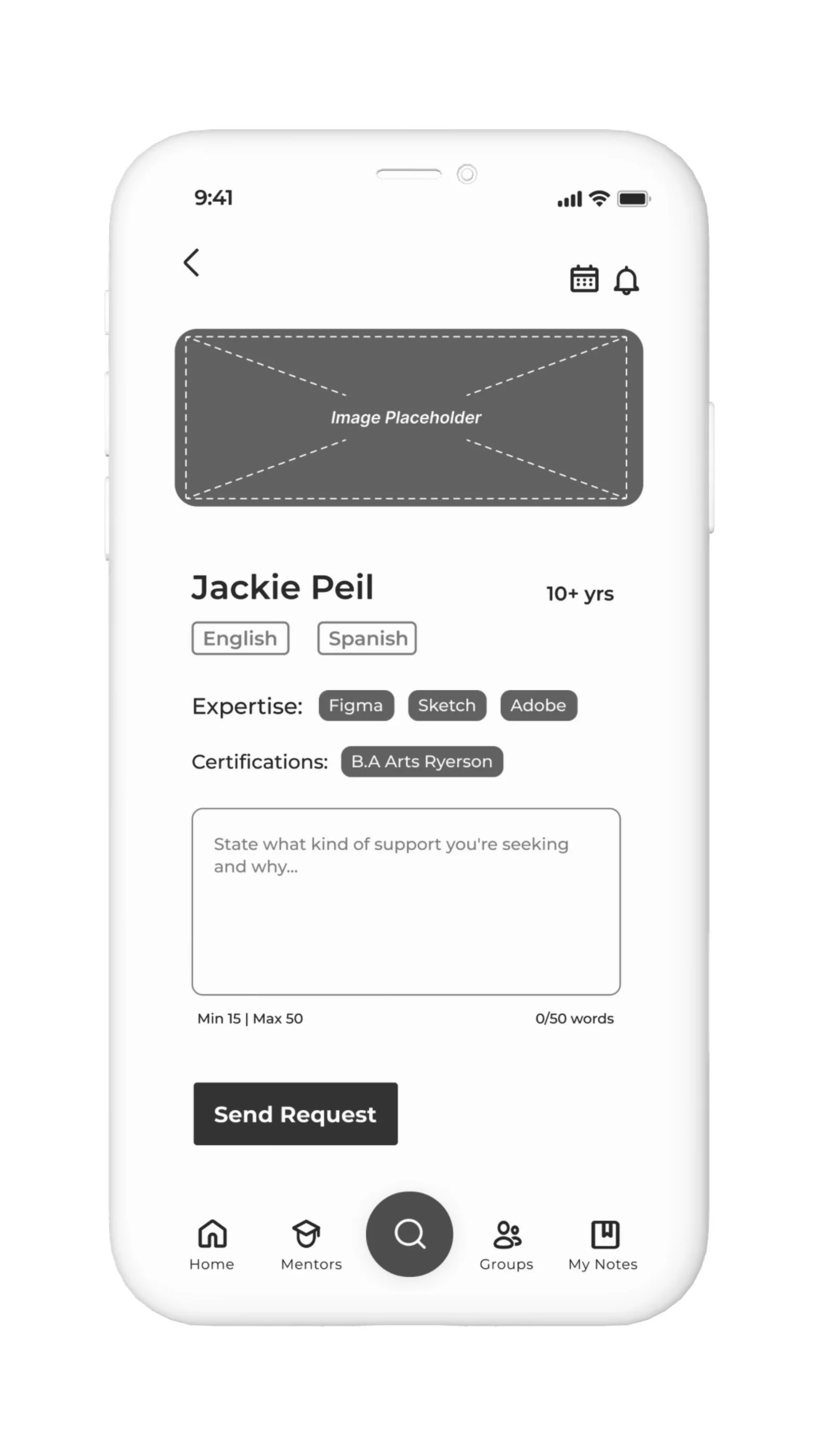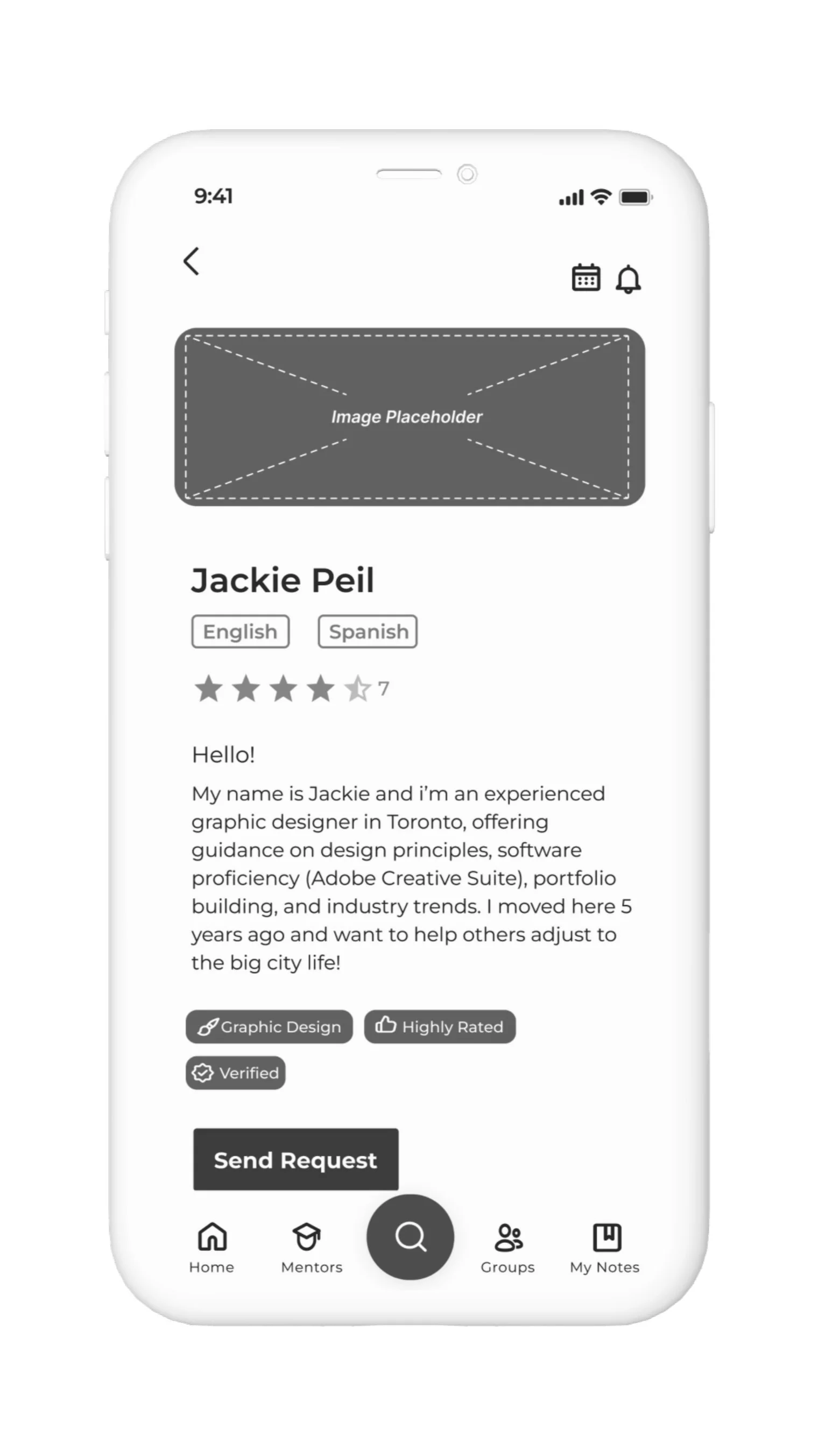 As part of the ideation phase, I determined that the task flow I wanted to focus on would be the process of searching for a mentor to fit my persona’s needs of connecting with someone to help/discuss his graphic design career. The flow would include: