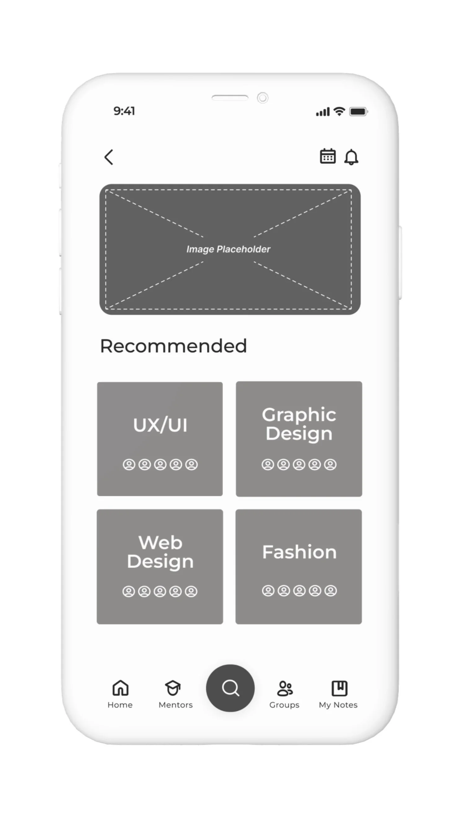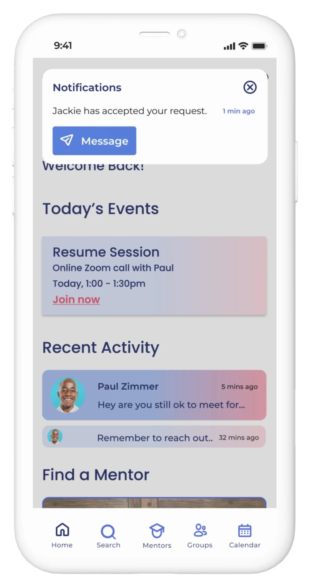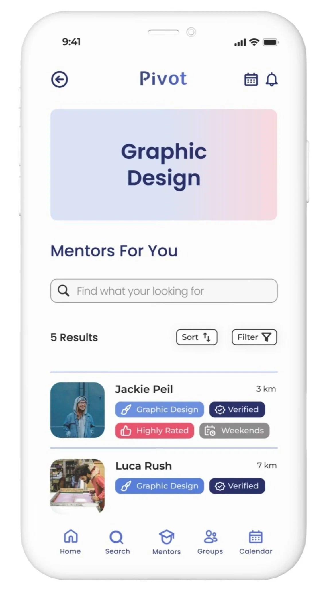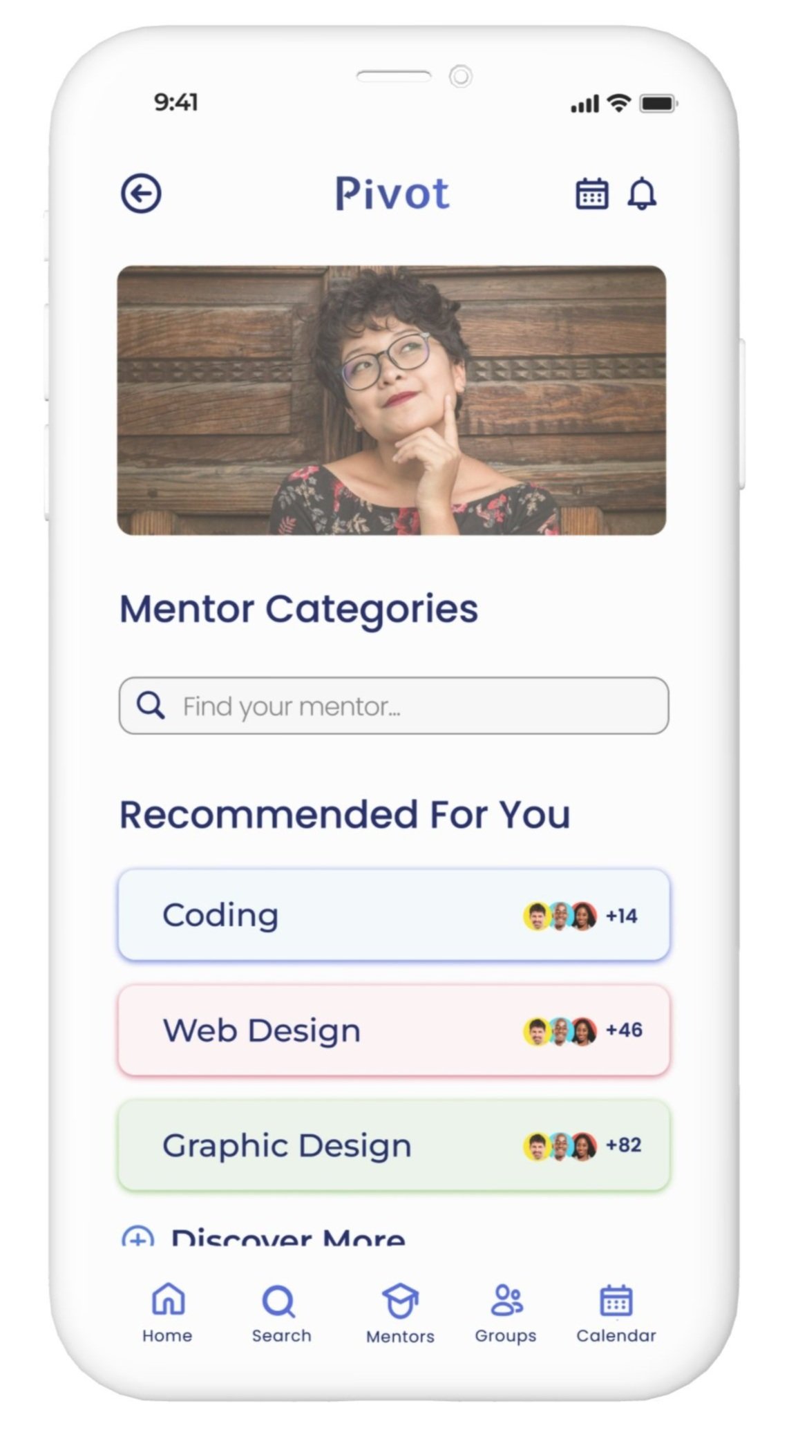 Category searches to find mentors/groups based on your initial setup to help you focus on hobbies and career goals.