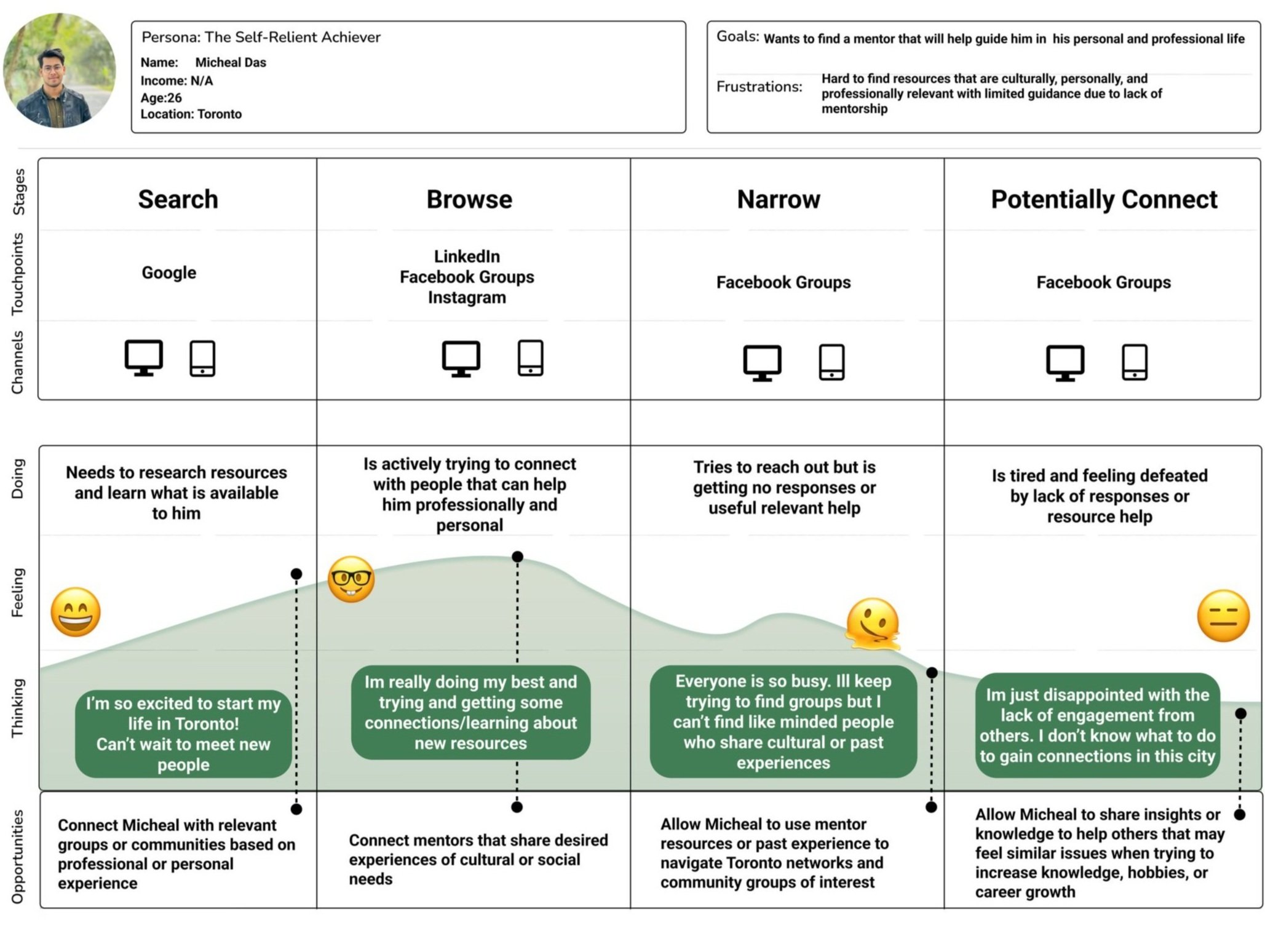After creating a persona, I set out to understand the journey of my persona’s current information landscape based on secondary research and interview insights.