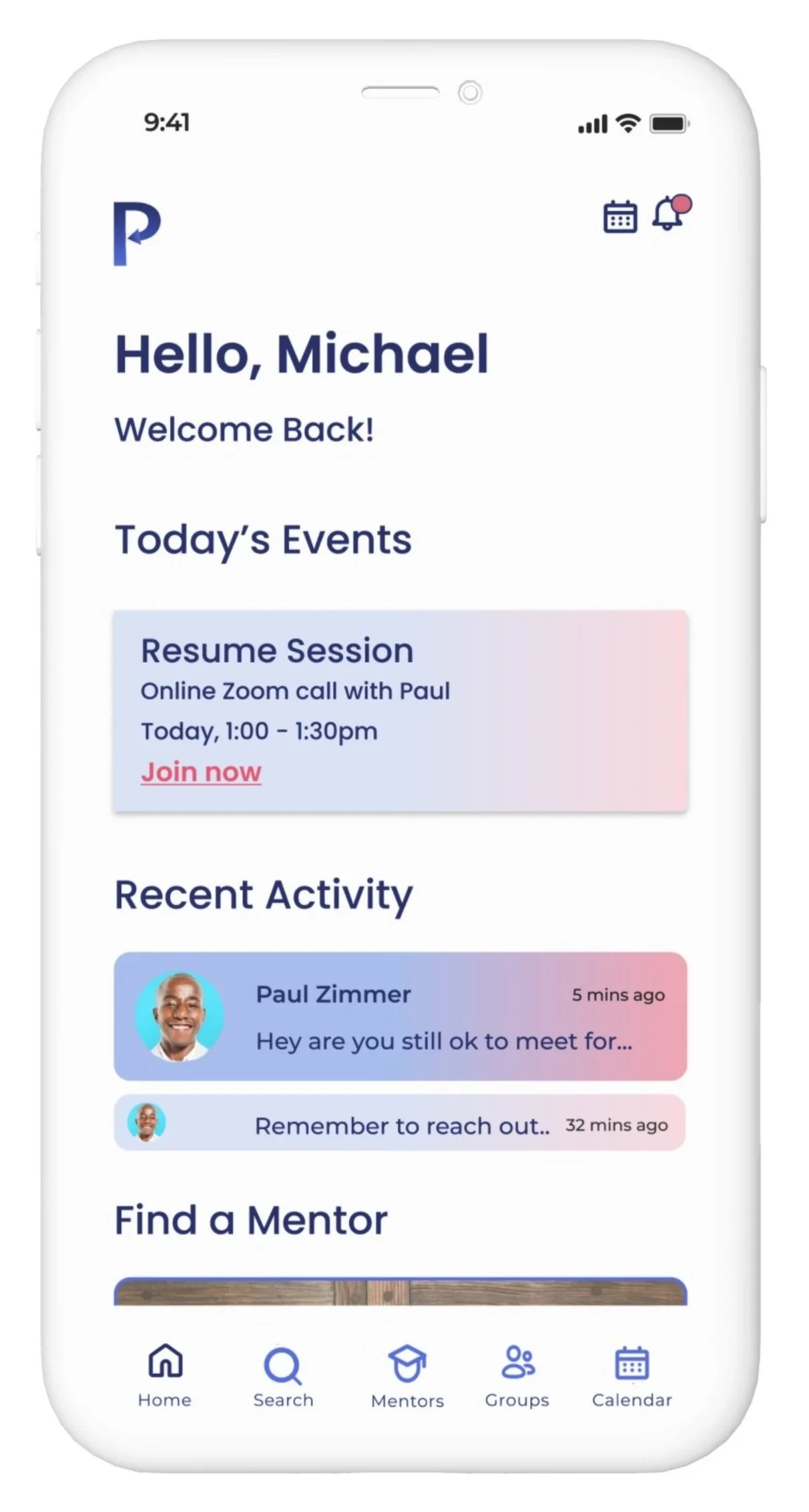 Providing quick links with recent activity including scheduled sessions with mentors, active chats, and mentor search options.