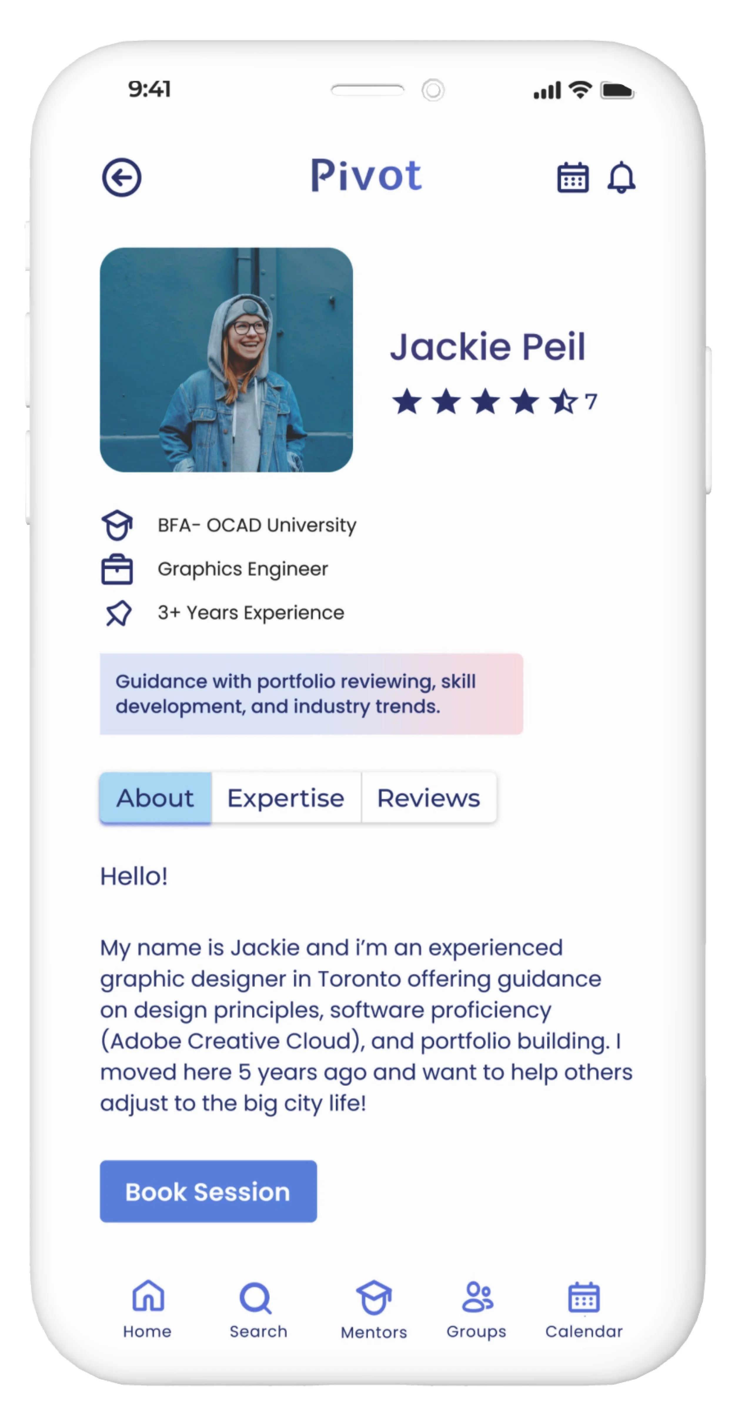 A space for mentors to list years of experience, expertise in the field, mentorship possibilities, educational background, and reviews from past mentor relationships.