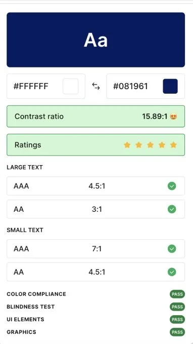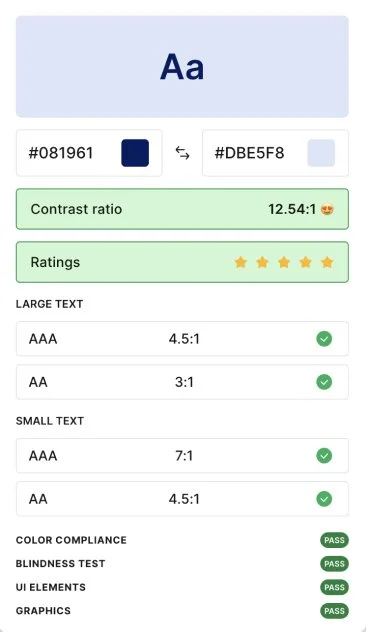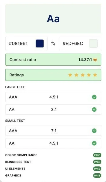 All colours used adhered to a minimum AA standard. In total, two colour combinations passed as AA compliant with all other colour combinations adhering to the maximum AAA compliance.