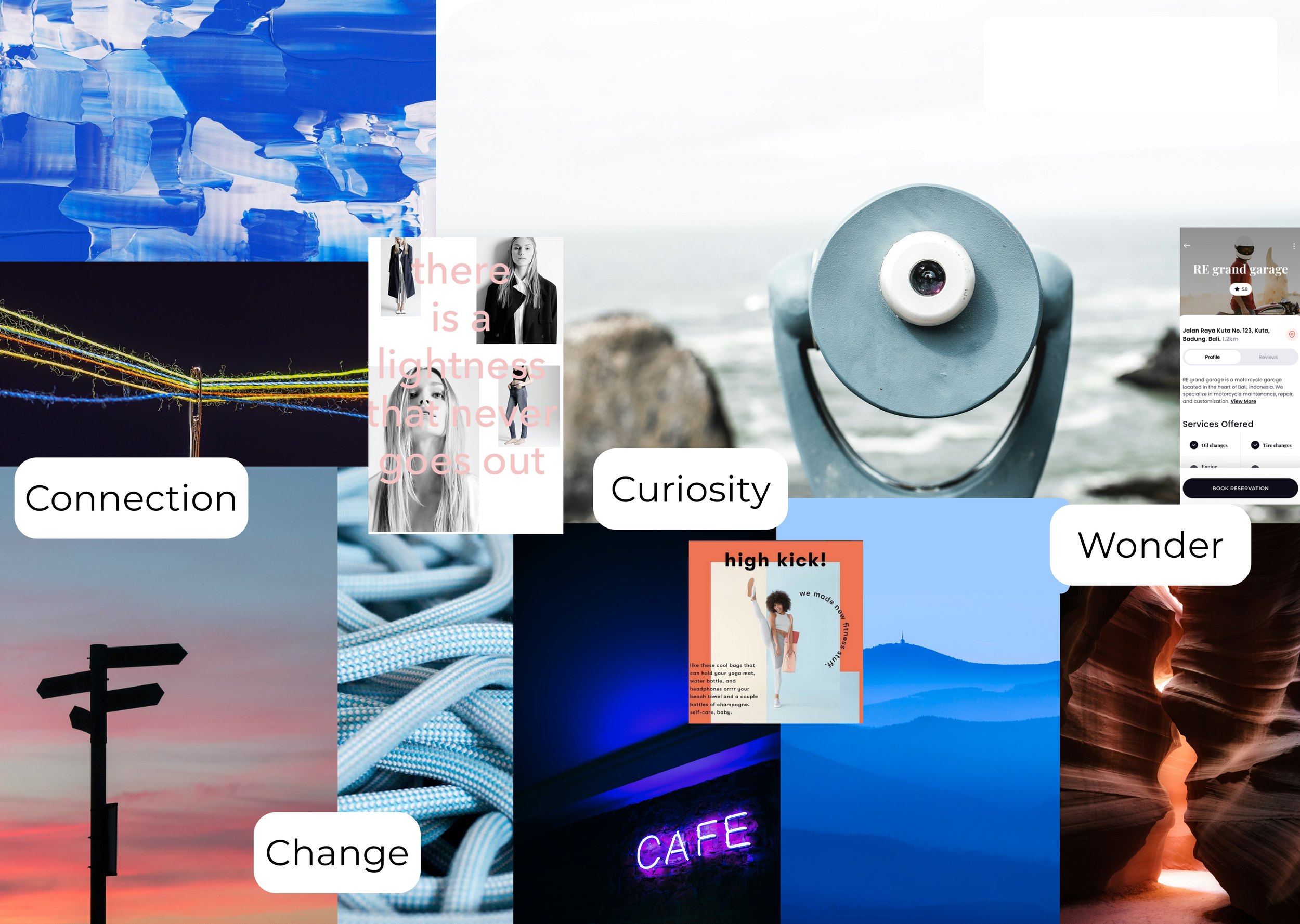 To understand how to apply colour, I created a moodboard with 4 keywords that embodied my persona’s journey and experiences. I felt that above all else, change was the biggest theme. Themes surrounding change and playing with the word led me to my product’s name Pivot.