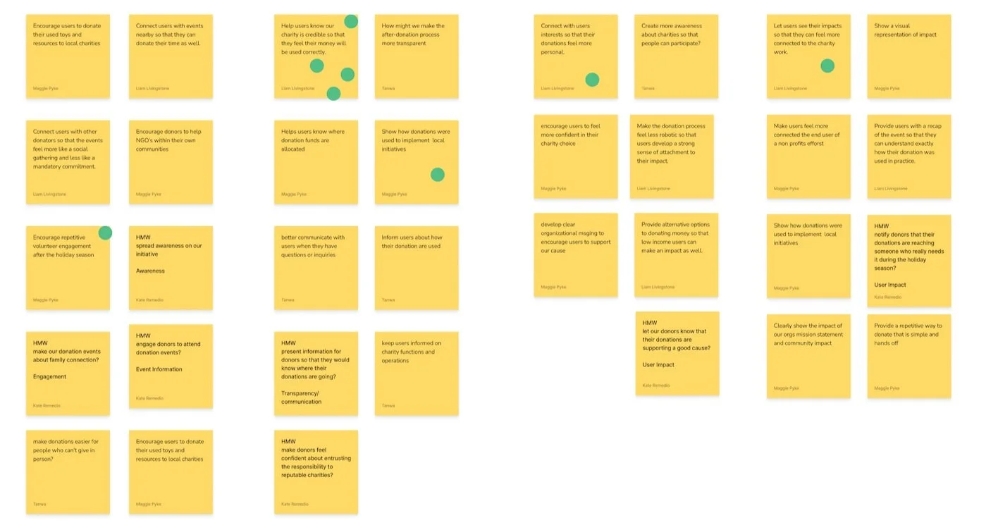 Next, we identified our target users. Recognizing the crucial role of volunteers, we focused our efforts on enhancing their experience. To achieve this, we conducted interviews with five participants who represented our target user group. Utilizing open-ended questions, we encouraged creative responses and gained valuable insights into their motivations, pain points, and behaviours related to the donation and volunteer process over the holiday season.
